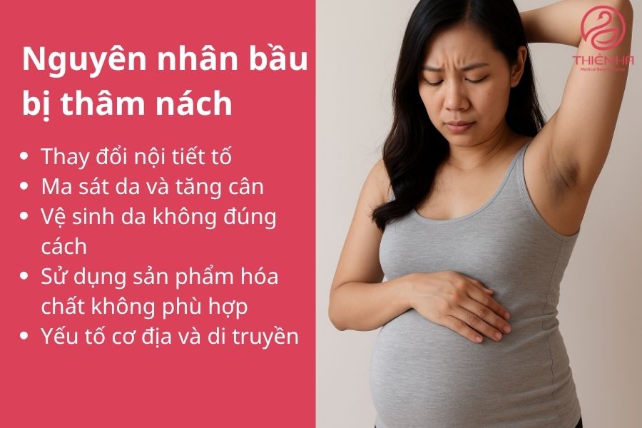Thay đổi nội tiết tố: Trong thai kỳ, nồng độ hormone Estrogen và Progesterone tăng cao, kích thích tế bào melanin hoạt động mạnh hơn, từ đó dẫn đến sự tăng sắc tố da, đặc biệt ở những vùng da nhạy cảm như nách.