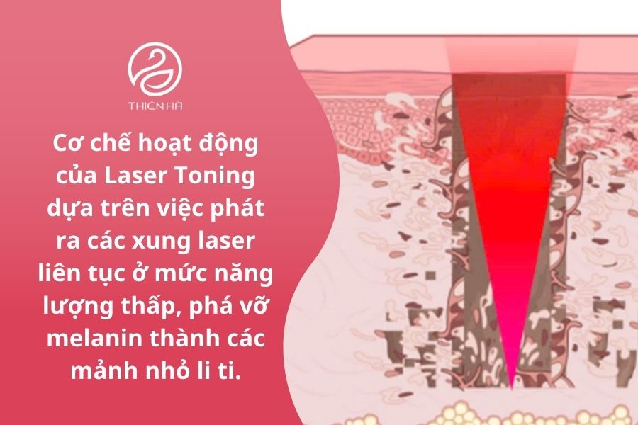 Cơ chế hoạt động của Laser Toning dựa trên việc phát ra các xung laser liên tục ở mức năng lượng thấp, phá vỡ melanin thành các mảnh nhỏ li ti. Những mảnh sắc tố này sau đó được cơ thể hấp thụ và đào thải một cách tự nhiên, không gây viêm hay bong tróc.