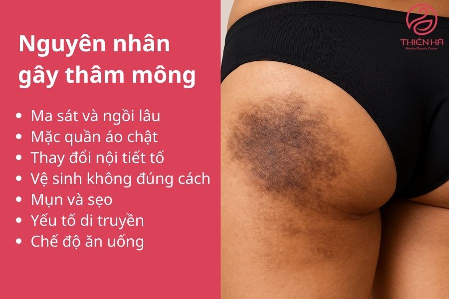 Nguyên nhân gây thâm mông thường đến từ ma sát, thói quen ngồi lâu, mặc quần áo bó sát, thay đổi nội tiết tố, vệ sinh chưa đúng cách, mụn và cả yếu tố di truyền. Những tác động này khiến da dễ kích ứng, tăng sắc tố và xuất hiện vết thâm nếu không được chăm sóc đúng cách.